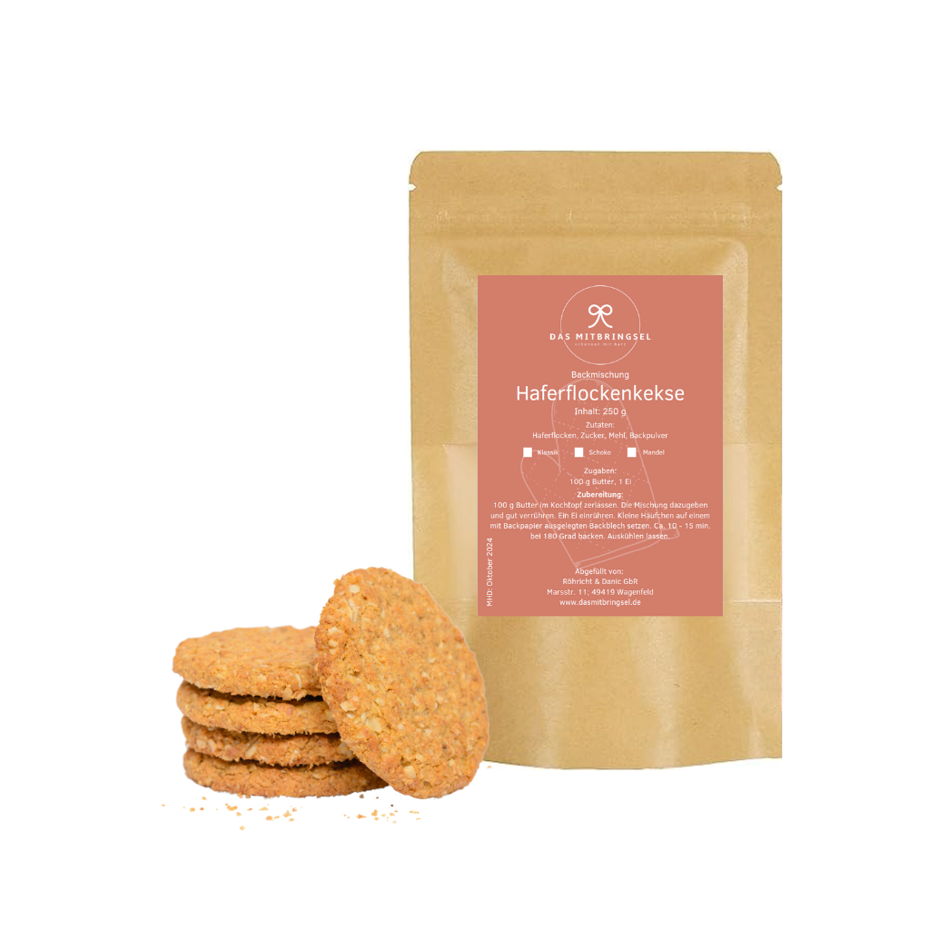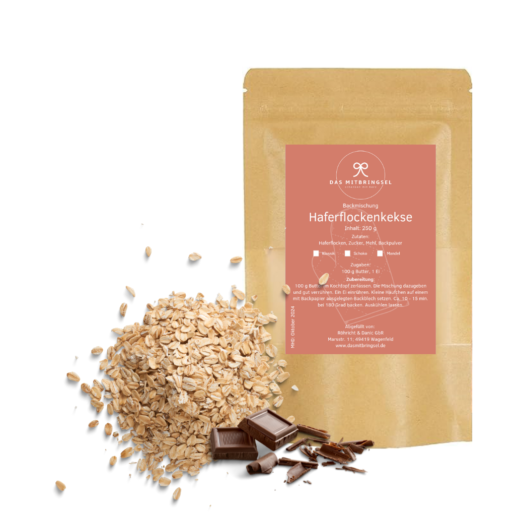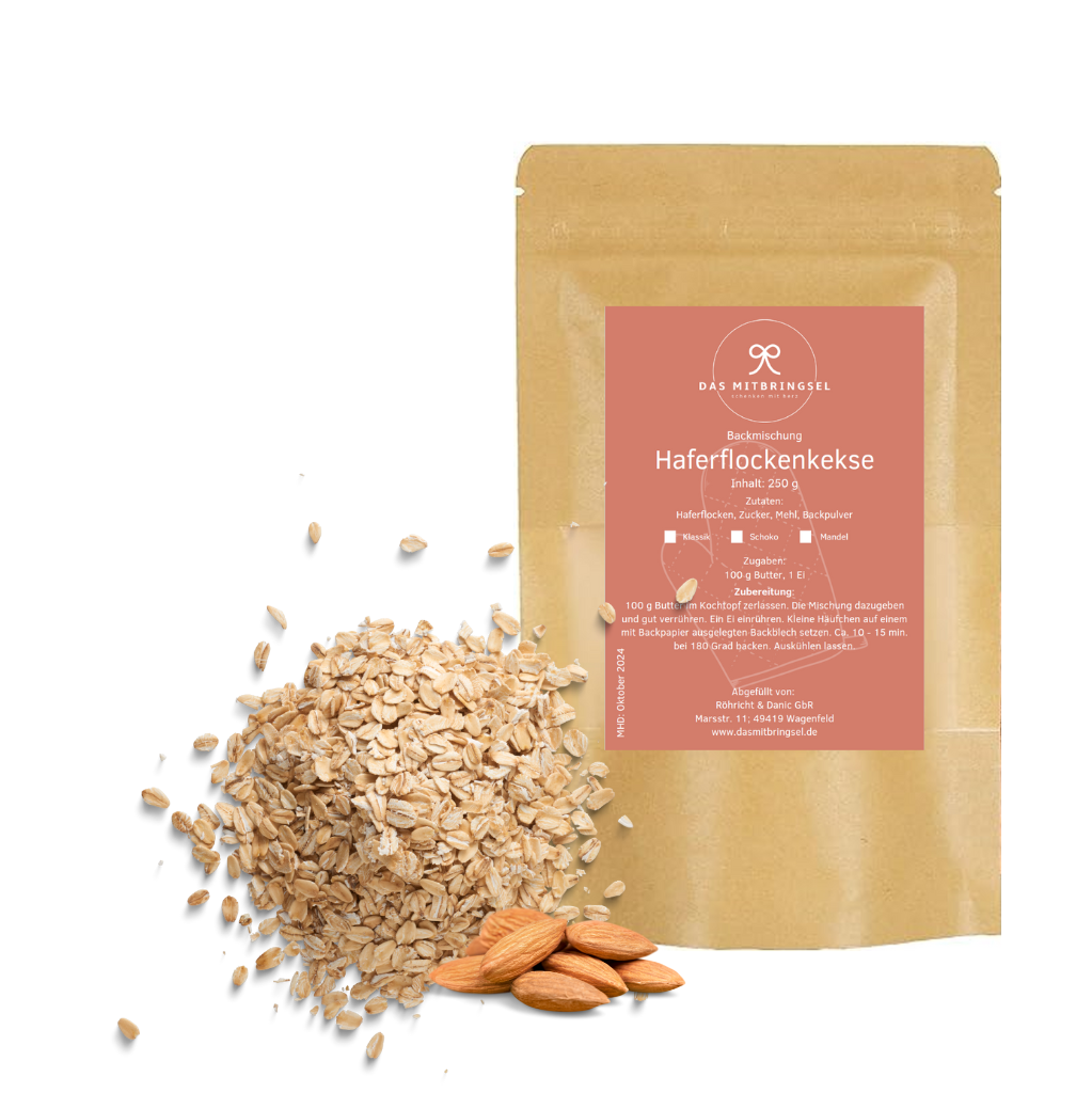 Mit der praktischen Backmischung für Haferflockenkekse gelingt das Backen im Handumdrehen. Die Mischung enthält bereits alle trockenen Zutaten wie Haferflocken, Mehl, Zucker und Backpulver. Einfach 100 g Butter und ein Ei hinzufügen, vermischen und im Nu sind leckere Kekse bereit zum Genießen!