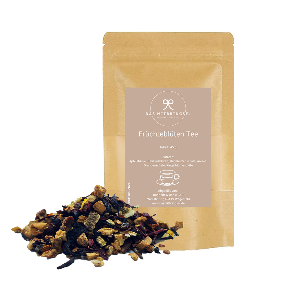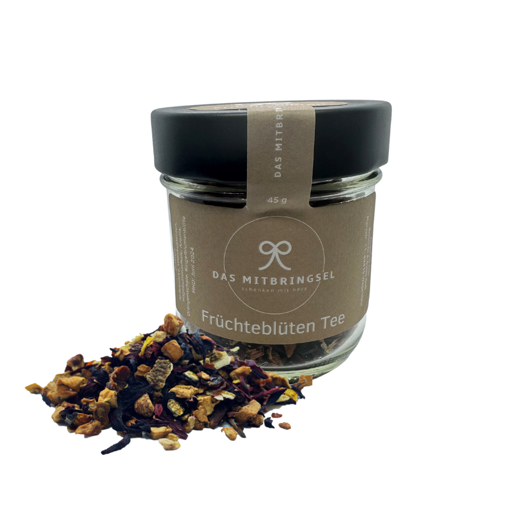 Früchteblüten Tee ist eine köstliche und duftende Mischung aus getrockneten Blüten verschiedener Früchte. Er zeichnet sich durch seine angenehme Süße und leichte Frische aus und eignet sich ideal zum Entspannen und Genießen. Der Tee kann sowohl heiß als auch kalt genossen werden und ist eine wunderbare Möglichkeit, die Aromen und natürliche Süße von Früchten in einer erfrischenden Tasse Tee zu erleben.