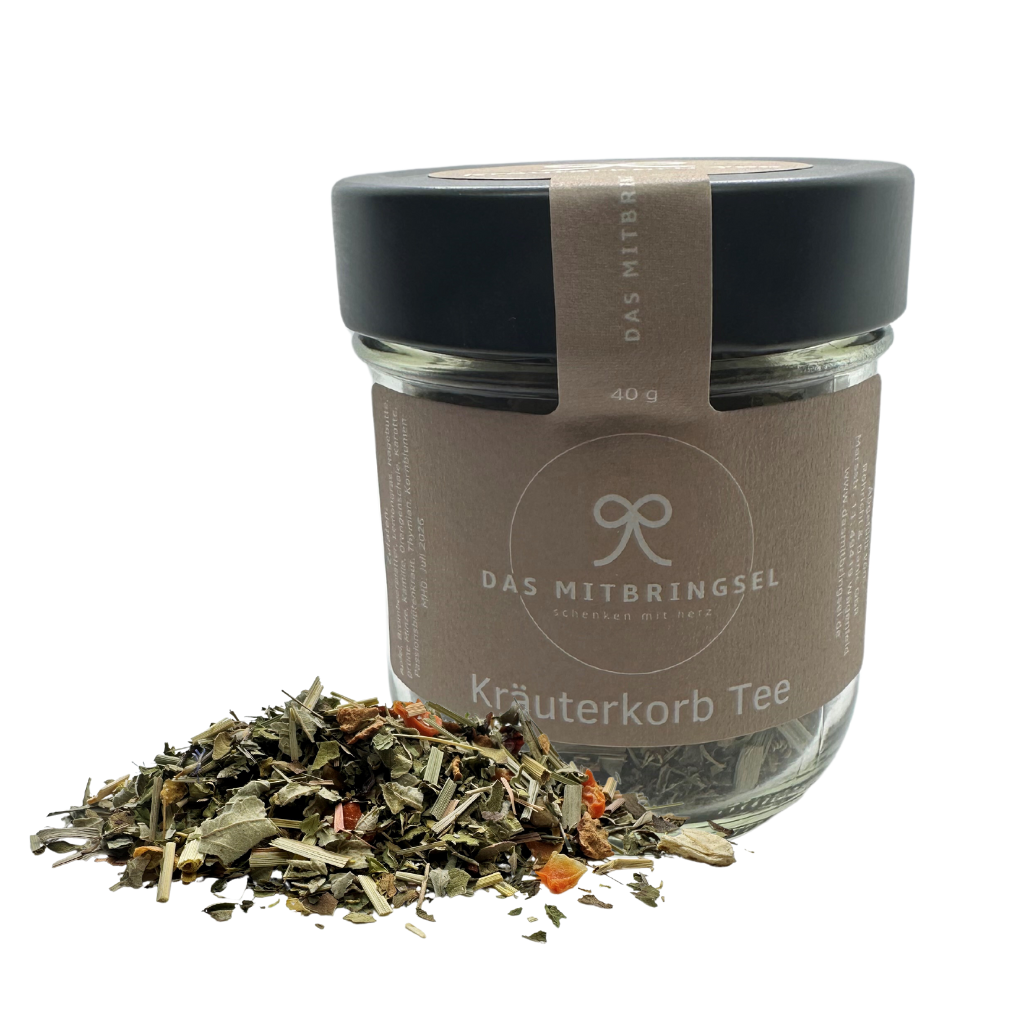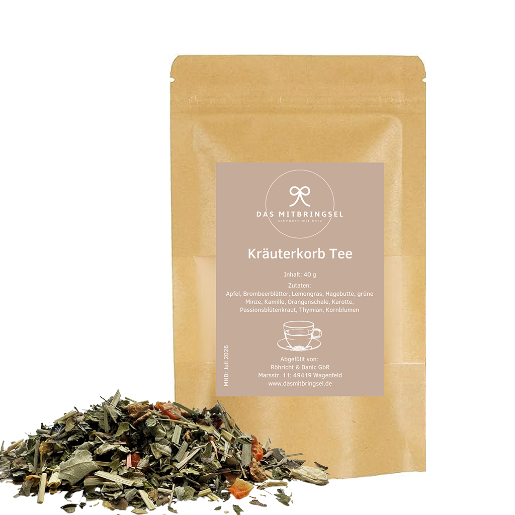 Der Kräuterkorb Tee ist eine köstliche Mischung aus sorgfältig ausgewählten Zutaten wie Apfel, Brombeerblättern, Lemongras, Hagebutte, grüner Minze, Kamille, Orangenschale, Karotte, Passionsblütenkraut, Thymian und Kornblumen. Diese vielfältige Kombination vereint fruchtige, zitrusartige und würzige Aromen zu einem harmonischen Genusserlebnis. Der Tee ist nicht nur geschmacklich ansprechend, sondern auch reich an natürlichen Inhaltsstoffen, die sowohl wohltuend als auch erfrischend sind, und somit eine perfekte Wahl für alle Teeliebhaber, die Vielfalt und Geschmack gleichermaßen schätzen.