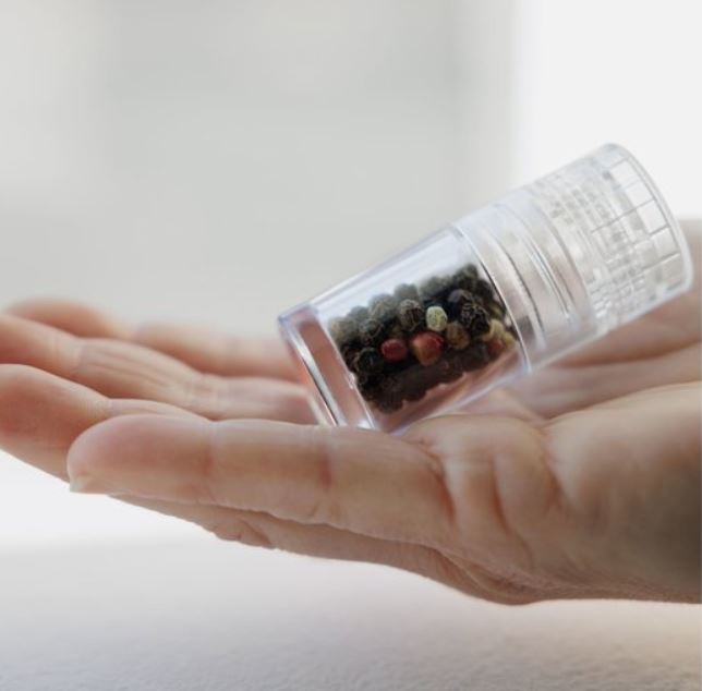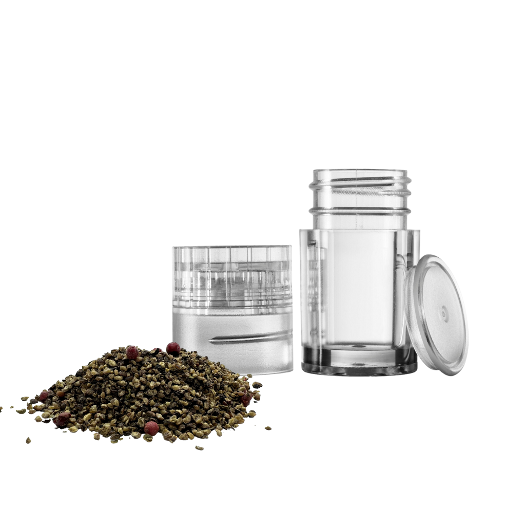 Kleine "Gewürzmühle" zum Mahlen von grobem Salz, Pfeffer, Chili uvm.. Für die Küche oder den gedeckten Tisch. Ebenso sinnvoll für unterwegs oder Camping. Handliches Format. Gesamtgröße mit Mühlenaufsatz: 65mm
